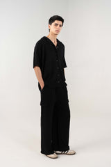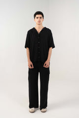 Master the monochromatic look with a set designed for the modern explorer. This pairing combines a half-sleeve button-down shirt with matching relaxed cargo pants, offering a cohesive silhouette that feels as lightweight as it looks sharp. The deep jet-black hue highlights the intricate texture of the slub cotton, providing a sophisticated alternative to basic flat jerseys.