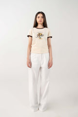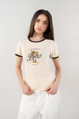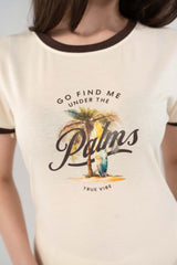 Capture that endless summer feeling with a top designed for both comfort and style. Our fitted graphic tee features a classic contrast binding at the neckline and sleeves, giving it a timeless "ringer" aesthetic. Crafted from a premium poly-modal fabric, this top feels exceptionally lightweight and soft against the skin, offering a subtle sheen and a flattering, body-hugging fit.